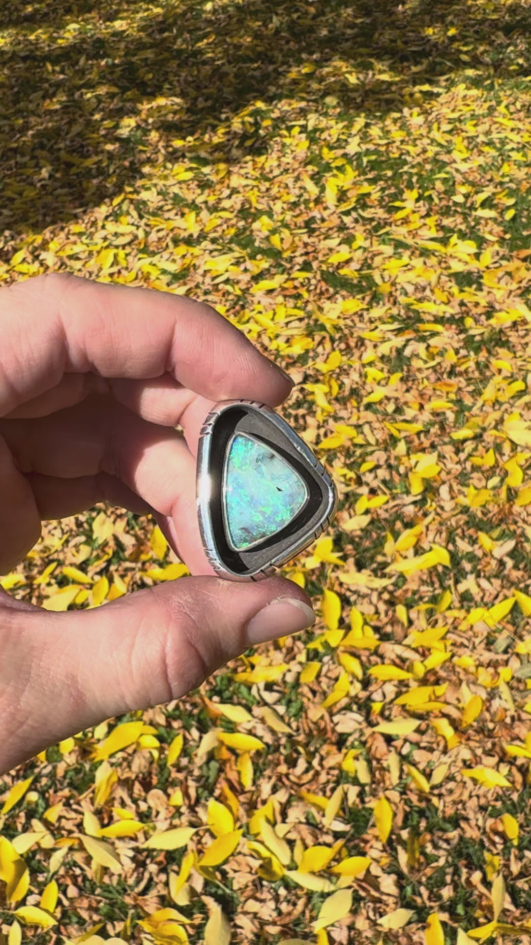 Australian opal set in a shadowbox setting. On a thick, textured and stamped band.