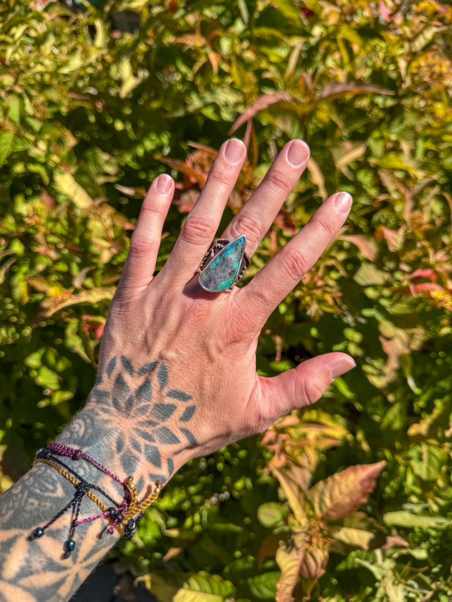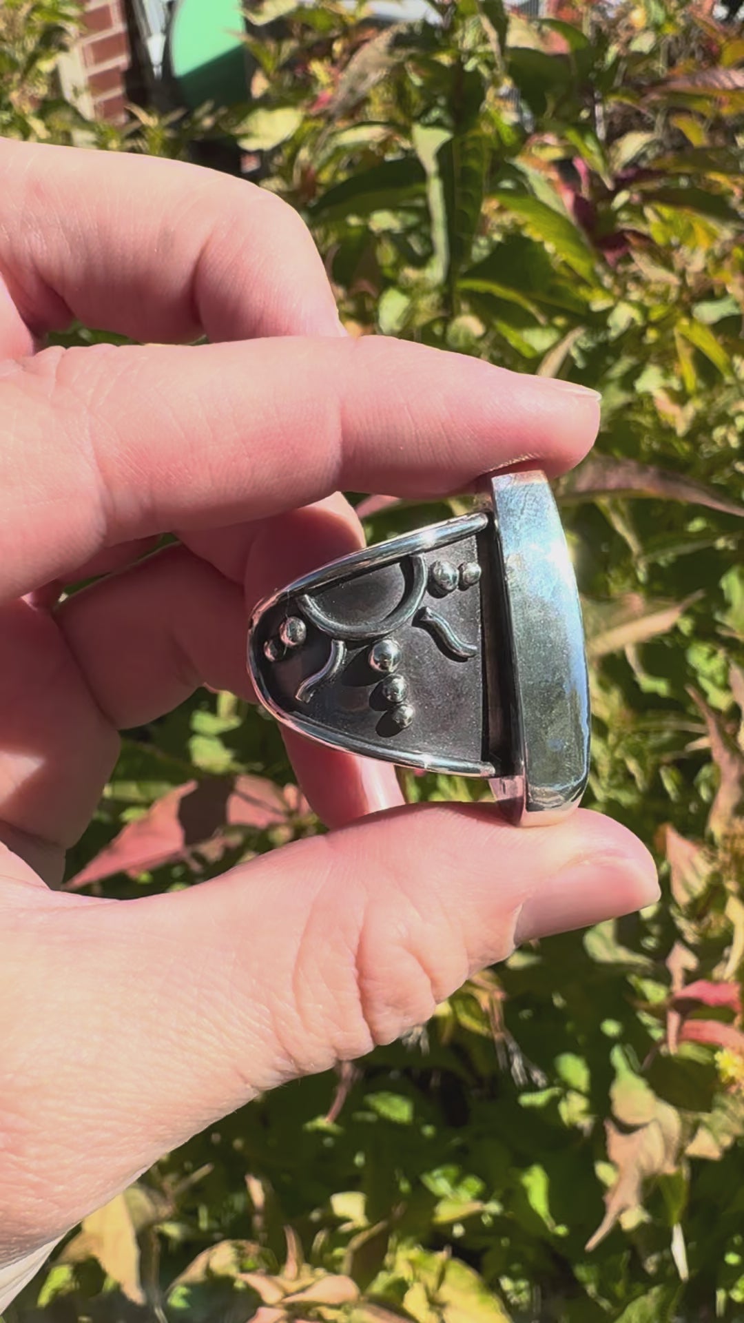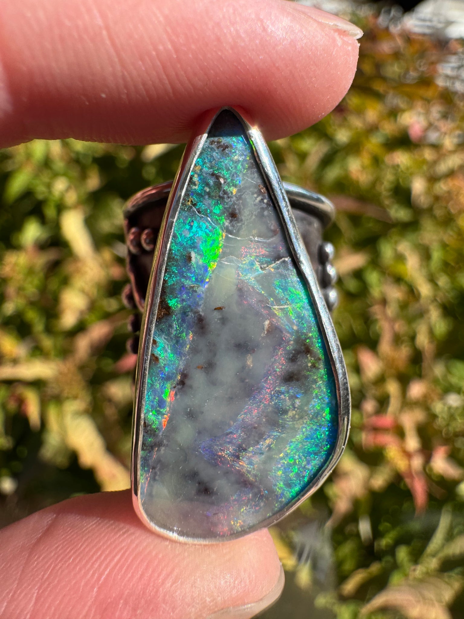 Biiiig statement Australian opal on sterling silver band featuring cute little suns on either side.